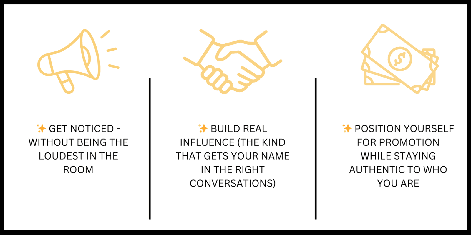 I’m going to walk you through a simple, proven process to get noticed for the right reasons - so you can build influence, attract opportunities, and finally land that next promotion without working harder or changing who you are.